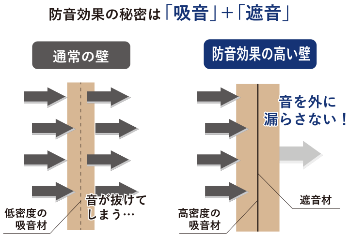 吸音と遮音を組み合わせる事により、防音効果を高めます。