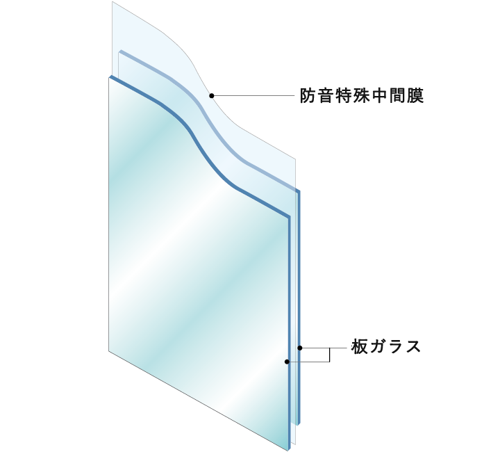 当社の防音ガラスは二枚のガラスで防音特殊中間膜を挟み込んだ、防音に最も適した「防音合わせガラス」になります。