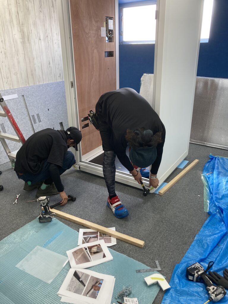 ショールーム設置の際は、ブースを構成する各パーツを現地で手作業で組み立てていきます。