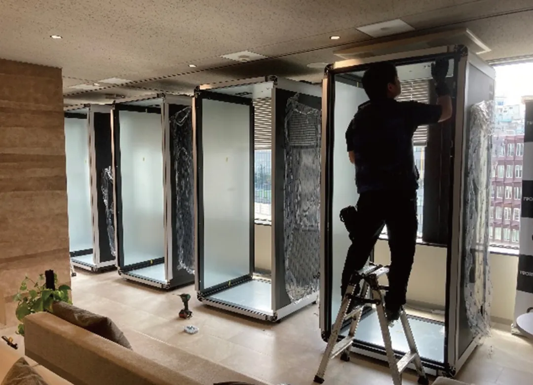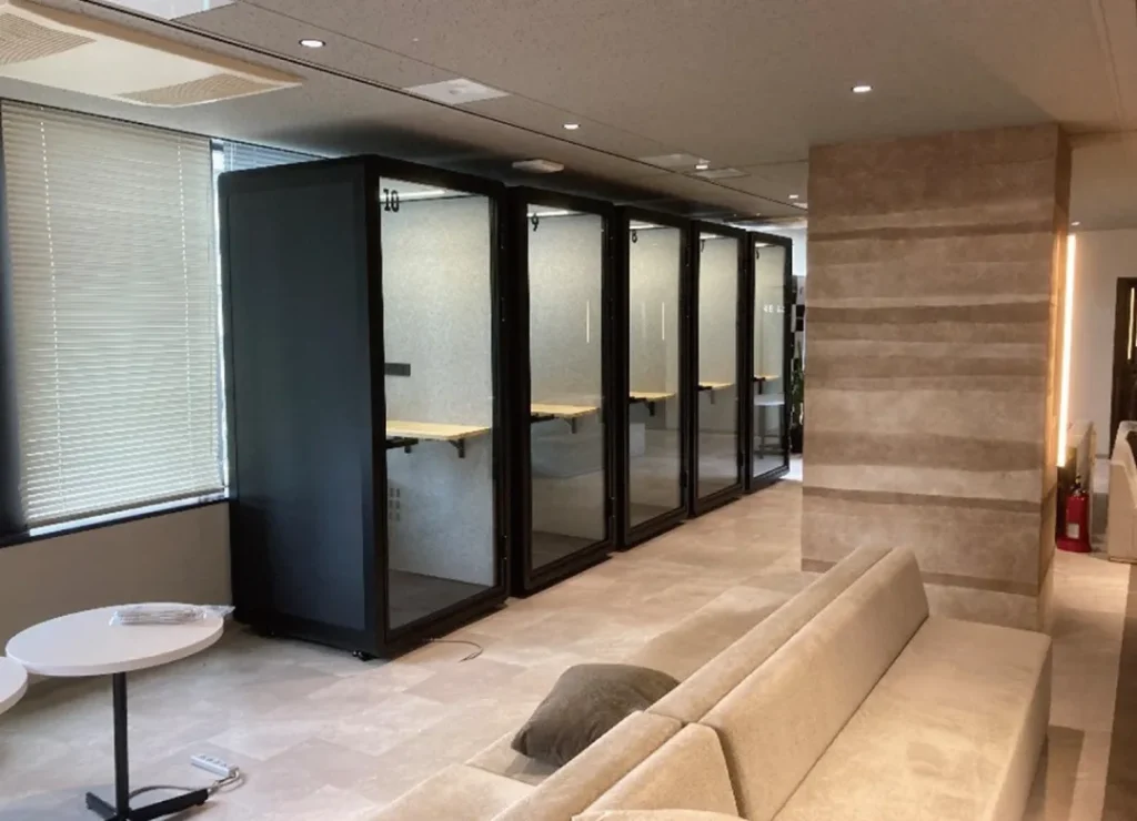以前、オフィスにも5台納品させて頂きましたが、今回は追加注文を頂き、フリースペースとなる場所に1人用個室ブースを5台設置させていただきましたので、事例としてご紹介します。