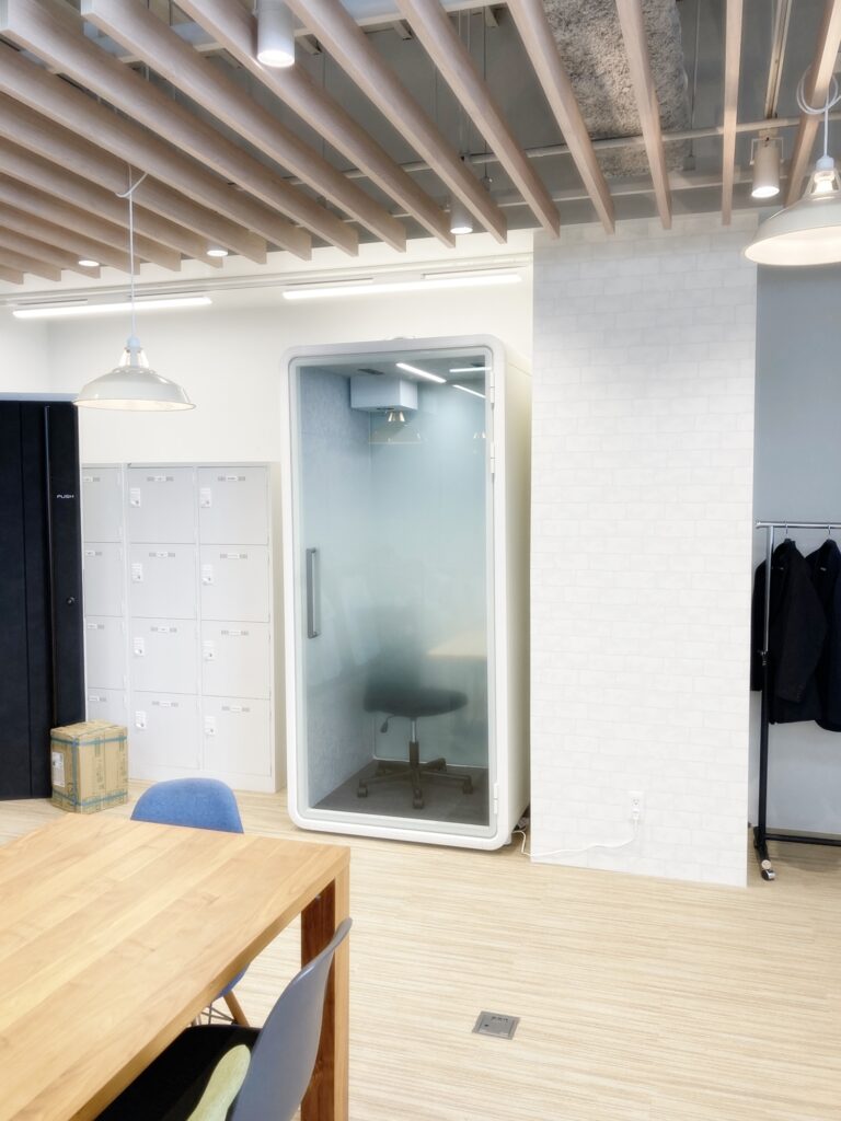 個室ブースを設置したことで、個別会議で使うスペースが確保できるようになりました。 これにより、web会議やクライアントとの打ち合わせなどでスムーズに利用できる環境が整いました。