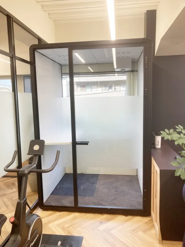 はい、変えられるんです!たとえば「天井が当たらないように高さを調整したい」とか、「ブースの色をオフィスに合わせたい」といった要望に応えてくれます。ガラスに飾りのシートを貼ったり、サイズを変えたりすることもできます。まさに“自分たちのためのブース”が作れるんですね。