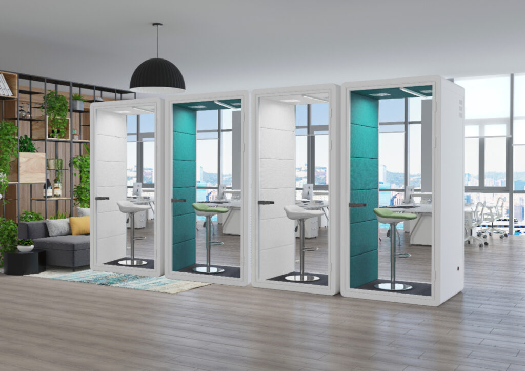 個室ブースのもう一つの重要なポイントは、音響性能とプライバシーの確保です。騒音を遮断し、プライベートな空間を保つためには、防音性能が高い素材や設計が求められます。特にオフィス環境では、周囲の雑音を遮断できることが作業効率を大幅に向上させます。