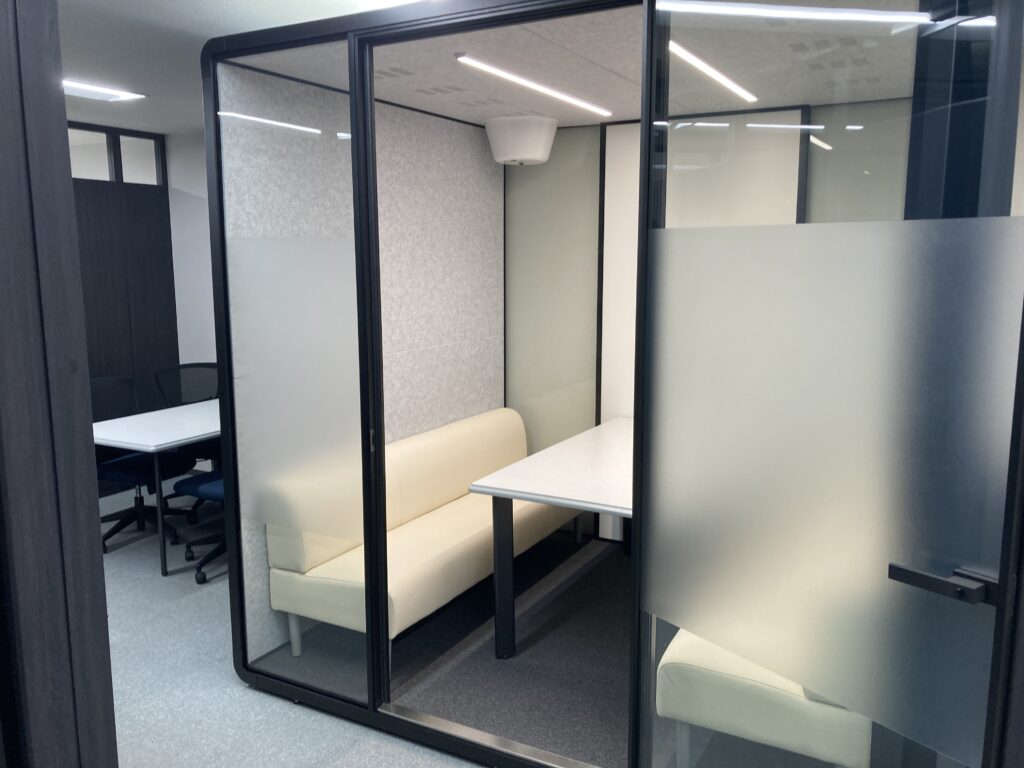 ブースはオフィスの一角、元々使われていなかった多目的スペースに配置。通路の動線や換気にも配慮し、壁面に寄せて横並びに配置にしたことで、視線も遮りつつ開放感を損なわないレイアウトになりました。ブース自体は同じ部屋でしたら解体せずに移動もできるので、今後のスペースの使用方法でも柔軟に対応できるのは嬉しいと思います