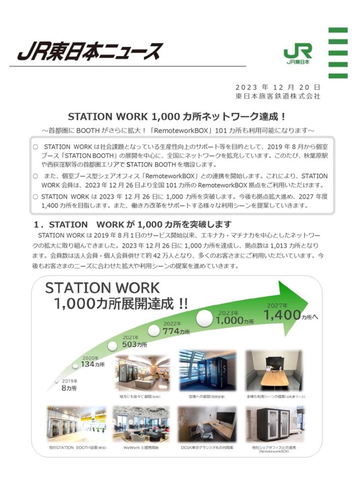 STATION WORKの拠点数は2023年に1,000か所を突破し、2027年には1,400か所に達すると予想されています。
