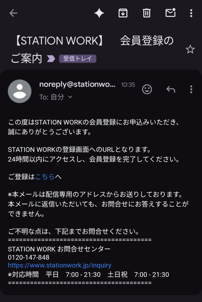 ➂メールアドレス宛に会員登録ページのURLが届くので、ご登録はこちらへをタップ