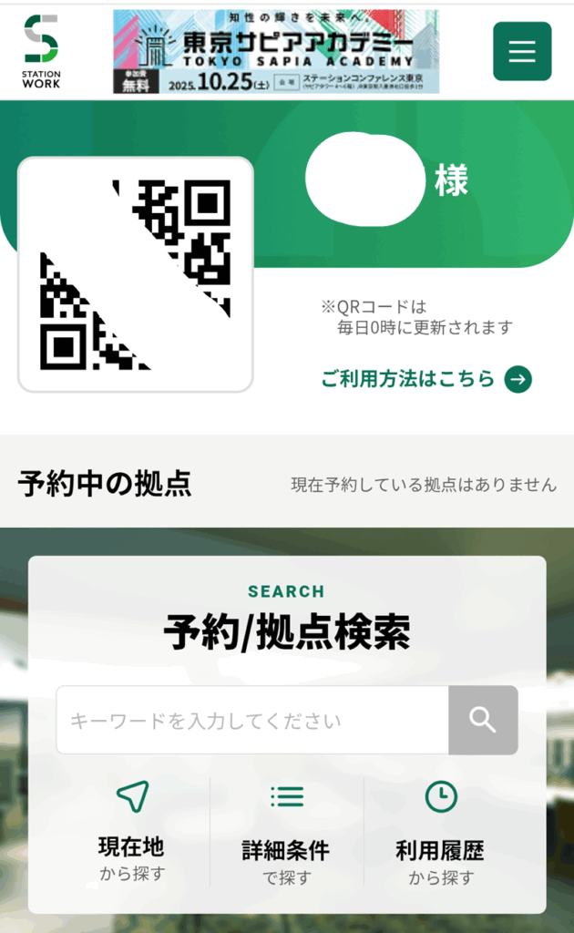 ①マイページの予約/拠点検索から利用したい拠点にSTATION WORKなどが存在するかを確認