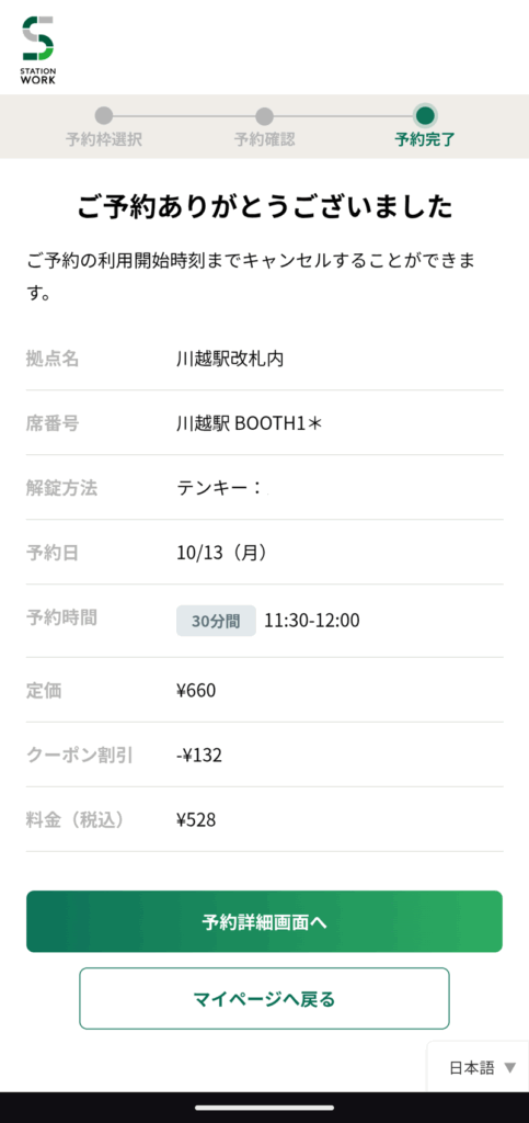 予約方法や使い方については、当記事の「ステーションワークを実際に使ってみた!」に詳しく書きましたので、そちらを参照ください