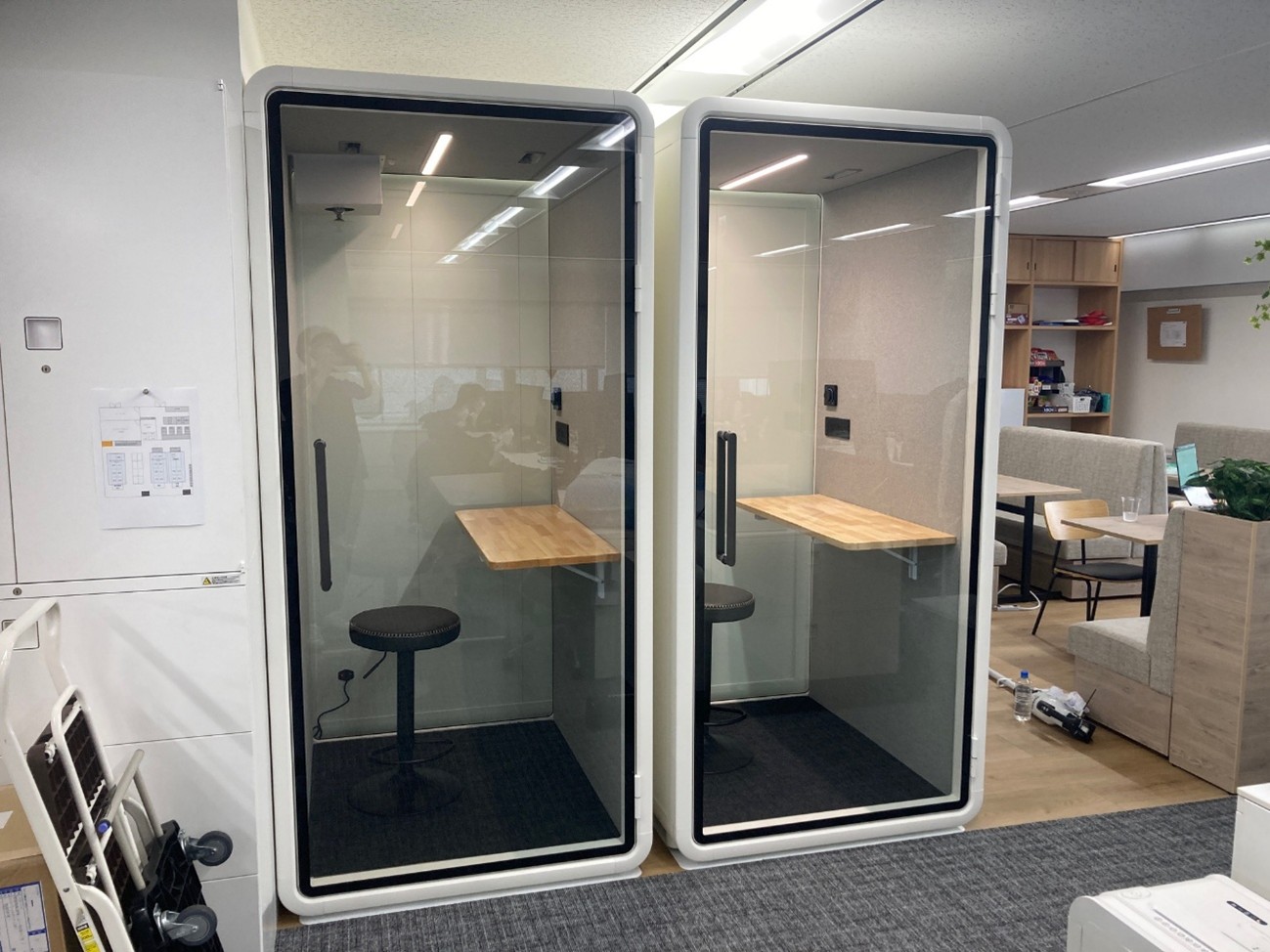 新宿区のオフィスにおいて、オンライン会議の増加による「会議室のバッティング問題」を、ワークブース3台の導入で解決しました。既製品のサイズに縛られず、利用者の快適性を優先した独自のサイズ拡張カスタマイズを行うことで、理想的なワークスペースを実現しています。