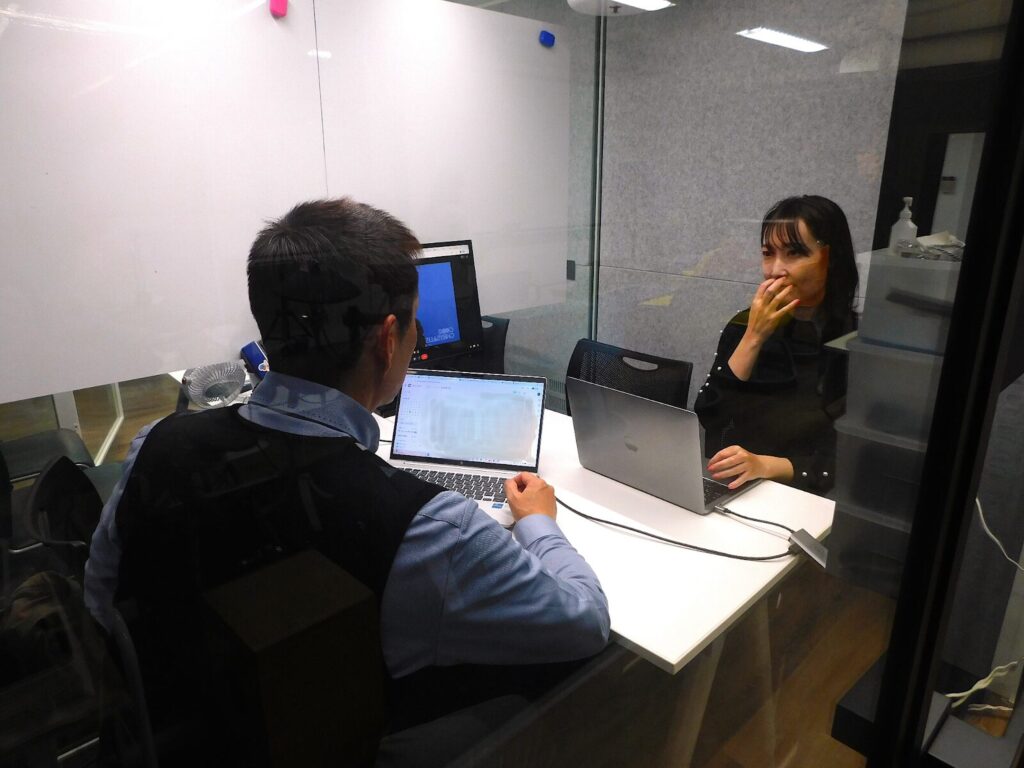 少し広いブースでは、スタッフ同士のワン・オー・ワンを行っています。